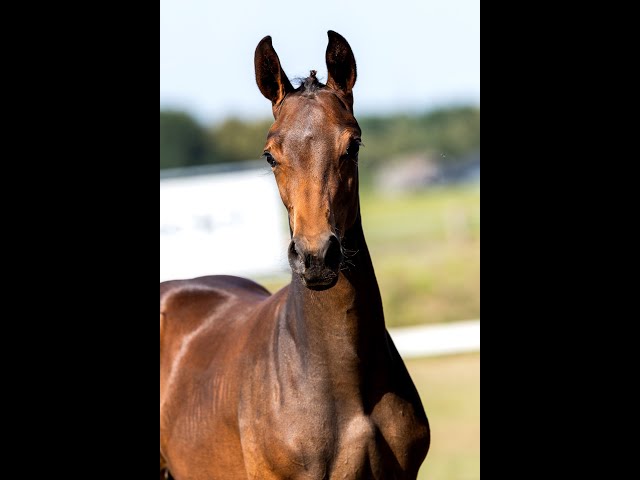 Wederom een opvallend veulen van de hengst Pjethro. Dit donkerbruine merrieveulen is het tweede veulen van de Z2 dressuurmerrie Junique. Haar vader Apache werd onlangs preferent verklaard en was uiterst succesvol op het allerhoogste niveau onder het zadel van Emmelie Scholtens. Grootmoeder Zonique behoorde als driejarige tot de top van de dressuurmerrie’s in Nederland en wist een overtuigende IBOP af te leggen. In combinatie met Dreamcatcher bracht ze ook het Z1 dressuurpaard Dominique. Verder is ze een halfzus van het lichte tour paard Nithard v. Investment.
