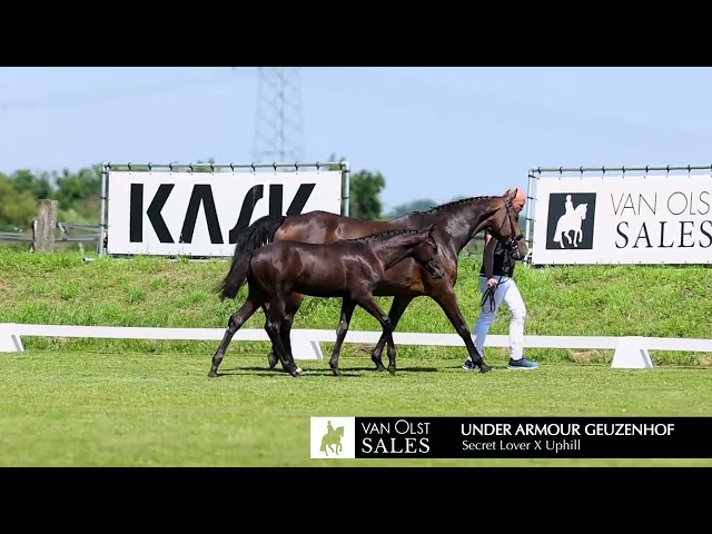 Dit zwartbruine hengstveulen komt uit de eerste volle jaargang van Secret Lover. Vorig jaar zijn een klein aantal veulens van hem geboren en de verwachting die zij toen schepten lijken nu bewaarheid te worden. Deze Under Armour Geuzenhof heeft een meer dan uitstekend model, 3 extra goed basisgangen en ook nog een moederlijn die zeer aansprekend is. Moeder Fendi Geuzenhof stamt af van de Grand Prix hengst Uphill en werd ster met oa 80 punten voor haar draf. Zij is een halfzus van het zware tour paard Djuice Geuzenhof v. Jazz, de lichte tour paarden Ici P. Geuzenhof en Jillz Geuzenhof beide afstammend van Charmeur en de ZZ licht paarden Esprit Geuzenhof v. Jazz en Whistle v. Rubin Royal. De zus van Fendi Geuzenhof, Benetton is bovendien de moeder van de bij het KWPN goedgekeurde hengst Nacho v. Negro en de bij het KWPN gewezen Paddington Geuzenhof v. Lantanas.